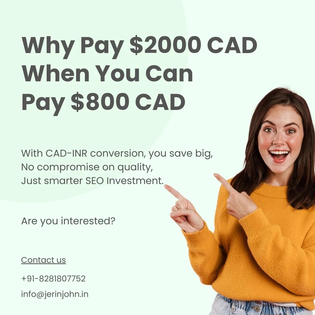 Many agencies in Canada charge upwards of $2,000 CAD for basic SEO plans that only cover surface-level changes. Jerin John offers the same—and often more—at a starting price of $800 CAD, because of the freelance model and the CAD-to-INR exchange advantage. At today’s rates, $800 CAD translates to roughly ₹48,000 INR, allowing you to access senior-level expertise, comprehensive audits, and ongoing optimization without the hefty agency fees. You receive full transparency on deliverables, regular performance reports, and the peace of mind that comes from working directly with a dedicated SEO consultant in Canada. Why pay more when you can get premium SEO services in Canada tailored to your needs for less?